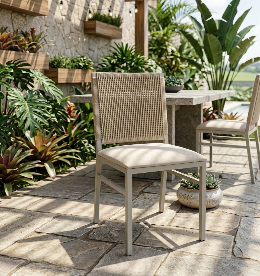 A Cadeira Camila é uma mistura de conforto e elegância, projetada para fazer de seu ambiente, um ambiente charmoso e fino. Produzido com alumínio estruturado e revestido em corda náutica naval estruturada e estofado em tecido impermeável, esta cadeira oferece um toque de modernidade e durabilidade que somente a Vilaça Móveis tem! Design Versátil e Acolhedor Com estofado no assento, esta Banqueta proporciona um conforto incomparável, ideal para um belo balcão ou bistrô, que você encontra também aqui na Vilaça Móveis, perfeito para relaxar e viver momentos incríveis em sua área gourmet, varanda, junto à piscina, no jardim ou mesmo em sua área interna. Seu design versátil se adapta perfeitamente a diferentes ambientes, trazendo um toque de elegância aonde quer que esteja.