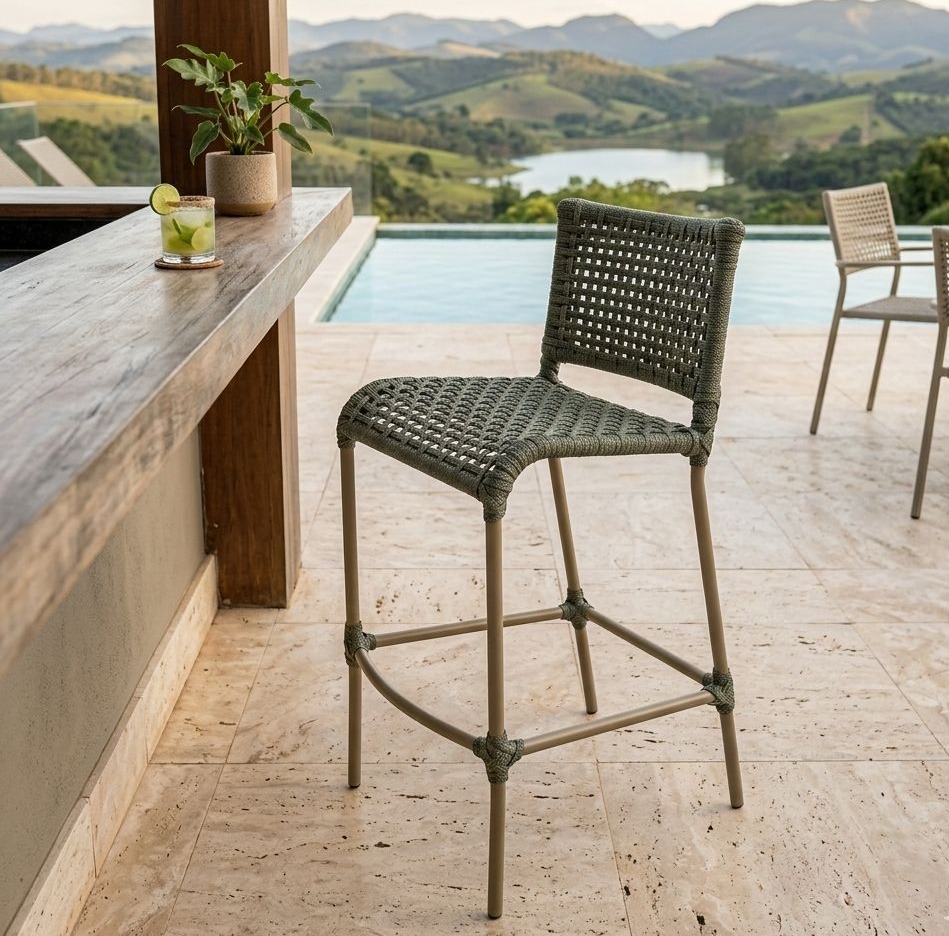 A Banqueta Dubai é uma mistura de conforto e elegância, projetada para fazer de seu abiente, um ambiente charmoso e fino. Produzido com alumínio estruturado e revestido em corda náutica naval estruturada, esta banqueta oferece um toque de modernidade e durabilidade que somente a Vilaça Móveis tem! Design Versátil e Acolhedor Esta banqueta proporciona um conforto incomparável, ideal para um belo balcão e/ou bistrô, que você encontra também aqui na Vilaça Móveis, perfeito para relaxar em sua varanda, junto à piscina, no jardim ou mesmo em sua área interna. Seu design versátil se adapta perfeitamente a diferentes ambientes, trazendo um toque de elegância aonde quer que esteja.