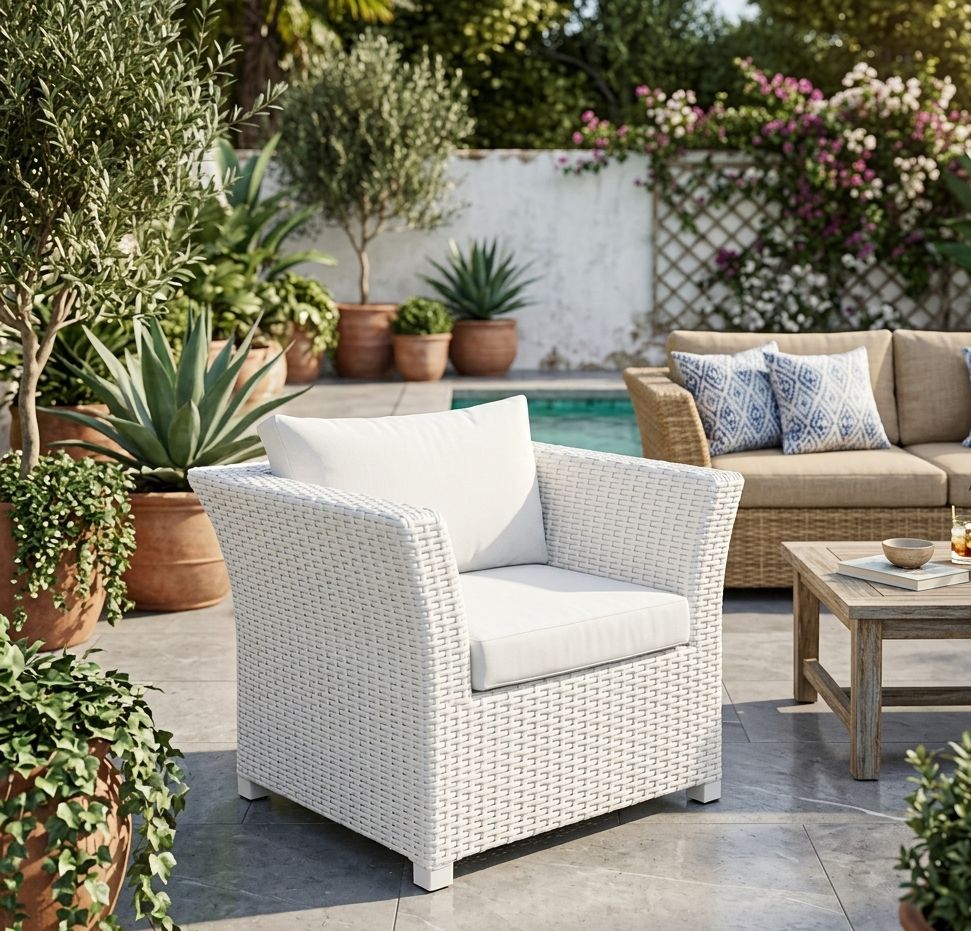 Poltrona para ambiente externo, estrutura em alumínio pintado com pintura eletrostática, trama em Fibra Sintática com matéria prima de alta qualidade, Almofadas removíveis em tecido impermeável oferecendo grande conforto ao sentar. Ideal para ser utilizada em sua varanda, piscina, jardim ou até mesmo sua área interna.CUIDADOS:Corda Náutica: Para limpeza das cordas, não utilizar produtos abrasivos, como álcool, solventes, nem palha de aço ou materiais semelhantes. Não utilizar lavadora com jato de pressão. Utilizar sabão neutro com uma esponja macia e pressão da água baixa, quando o móvel se encontrar em lugar fechado, úmido e com pouca circulação de ar, por exemplo: piscina aquecida ou sauna, deverá ser feita a limpeza mensalmente, para evitar a proliferação de fungos e mofo.Alumínio polido: Para manter o brilho, utilize cera automotiva, tomando cuidado para não aplicar sobre as fibras, cordas e tecido. Aplicar somente no produto seco e limpo.Tecidos: Para os tecidos, limpar diariamente com pano branco umedecido em água, na temperatura ambiente e secar. Eliminar sujeiras acidentais com pano limpo, esponjado ou papel absorvente, sem comprimir para dentro do tecido. Após a limpeza, não armazenar em local úmido. Não utilizar produtos abrasivos, como escovas com cerdas, jatos de água, esponjas abrasivas ou produtos químicos (alcalinos e clorados), tais como: detergentes em pó, solventes, cloro e outros. |