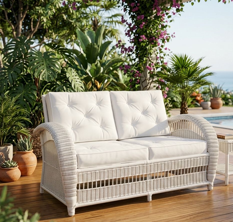 Sofá para ambiente externo, estrutura em alumínio pintado com pintura eletrostática, trama em Fibra Sintática com matéria prima de alta qualidade, Almofadas removíveis em tecido impermeável oferecendo grande conforto ao sentar. Ideal para ser utilizada em sua varanda, piscina, jardim ou até mesmo sua área interna.CUIDADOS:Corda Náutica: Para limpeza das cordas, não utilizar produtos abrasivos, como álcool, solventes, nem palha de aço ou materiais semelhantes. Não utilizar lavadora com jato de pressão. Utilizar sabão neutro com uma esponja macia e pressão da água baixa, quando o móvel se encontrar em lugar fechado, úmido e com pouca circulação de ar, por exemplo: piscina aquecida ou sauna, deverá ser feita a limpeza mensalmente, para evitar a proliferação de fungos e mofo.Alumínio polido: Para manter o brilho, utilize cera automotiva, tomando cuidado para não aplicar sobre as fibras, cordas e tecido. Aplicar somente no produto seco e limpo.Tecidos: Para os tecidos, limpar diariamente com pano branco umedecido em água, na temperatura ambiente e secar. Eliminar sujeiras acidentais com pano limpo, esponjado ou papel absorvente, sem comprimir para dentro do tecido. Após a limpeza, não armazenar em local úmido. Não utilizar produtos abrasivos, como escovas com cerdas, jatos de água, esponjas abrasivas ou produtos químicos (alcalinos e clorados), tais como: detergentes em pó, solventes, cloro e outros. |