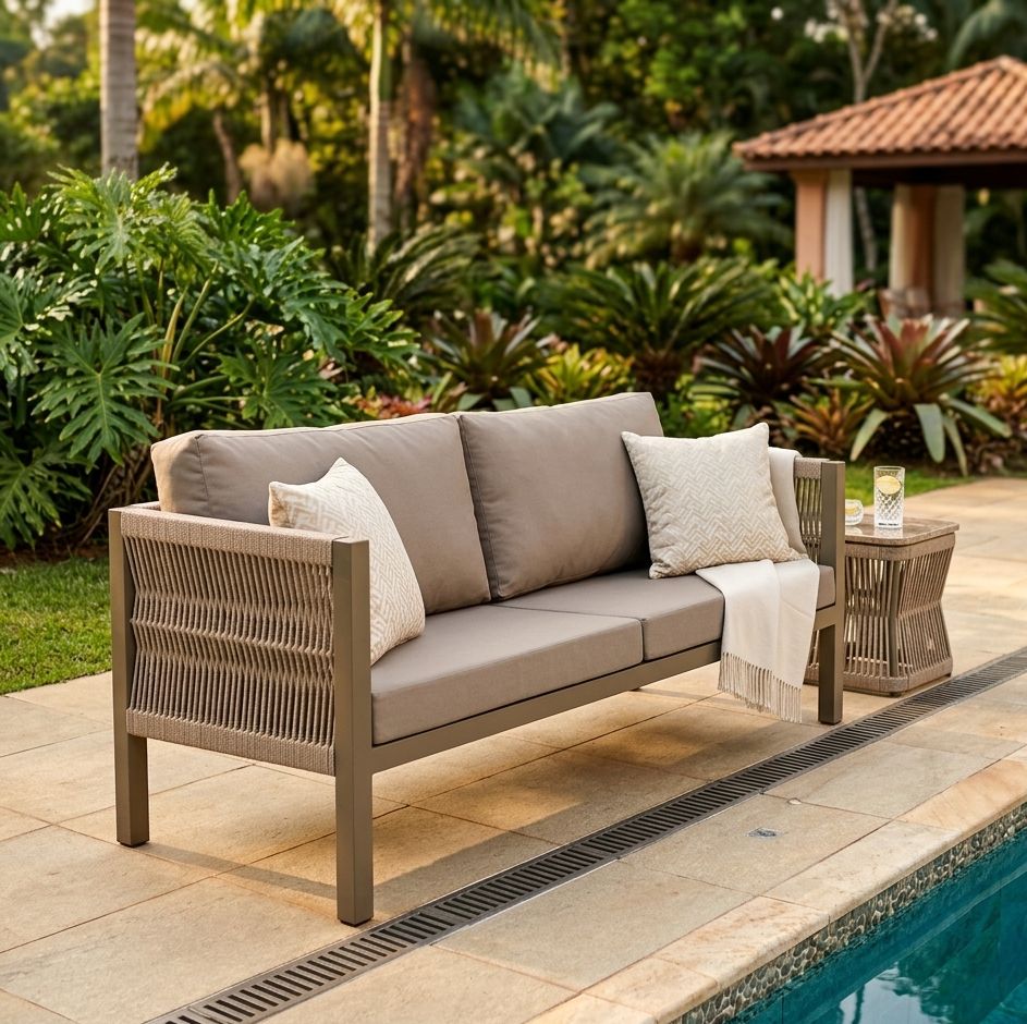 O Sofá Capitólio é uma mistura de conforto e elegância, projetada para fazer de seu ambiente, um ambiente charmoso e fino. Produzido com alumínio estruturado e revestido em corda náutica naval estruturada e estofado em tecido impermeável, esta Poltrona oferece um toque de modernidade e durabilidade que somente a Vilaça Móveis tem!